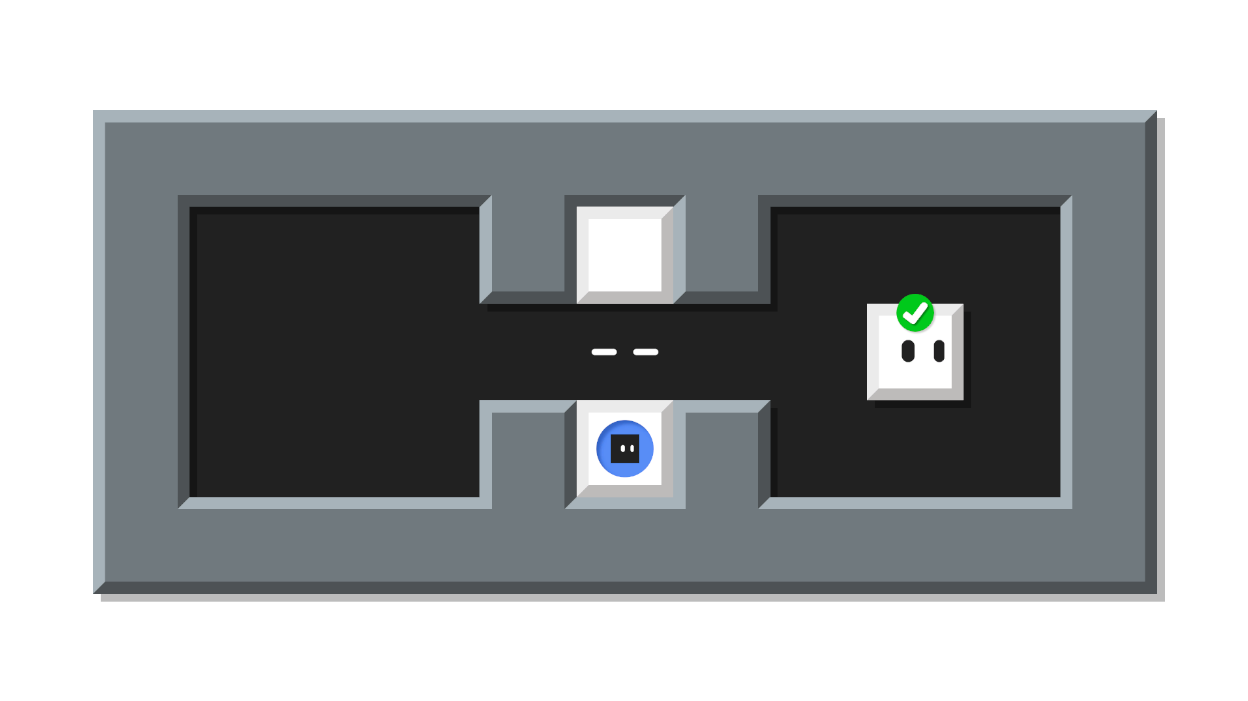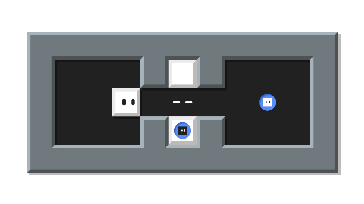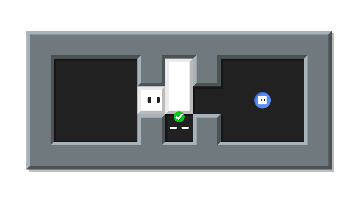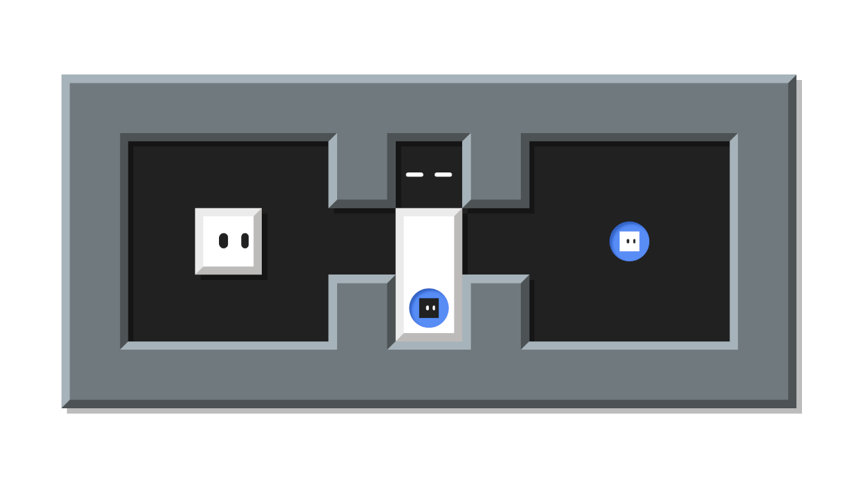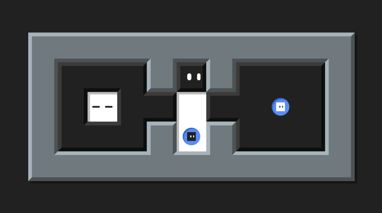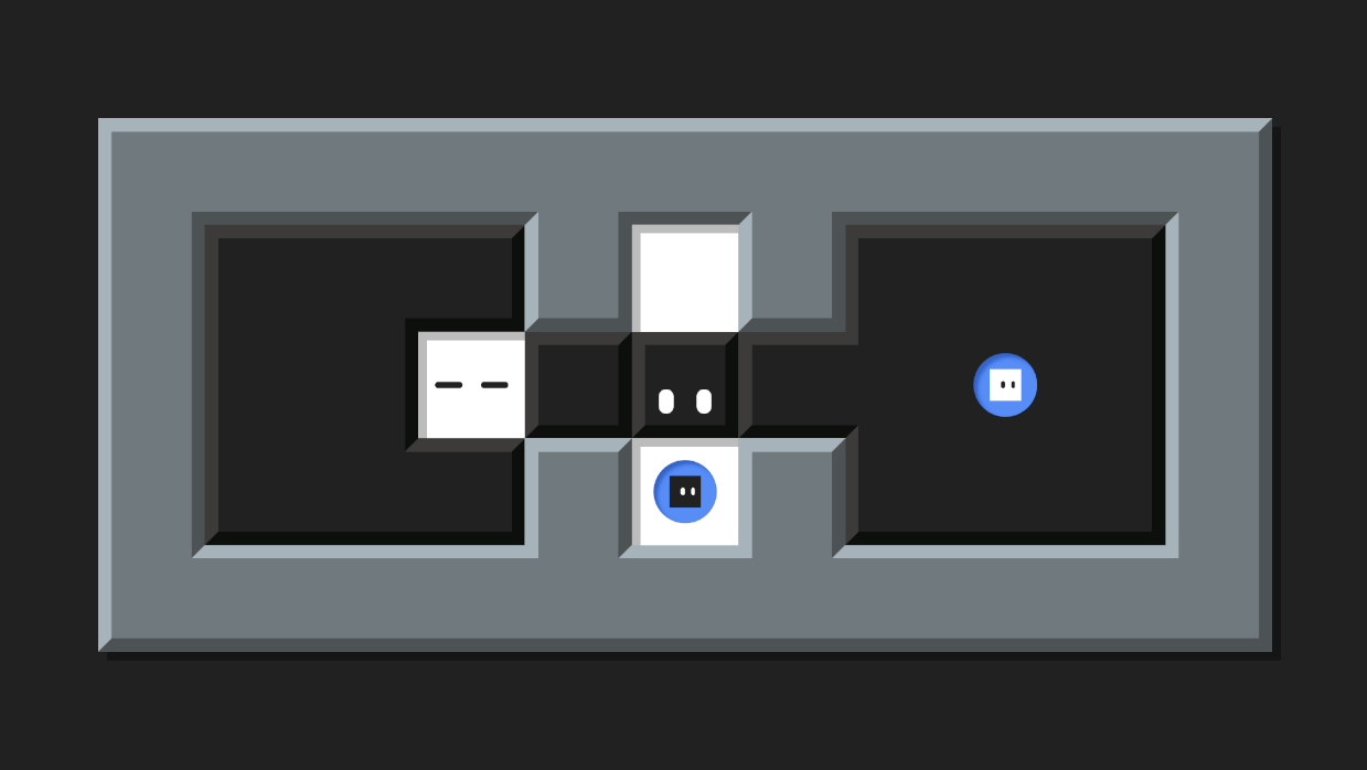 In this demo level, the black character can get to its goal easily, but the white character is blocked by a white wall.